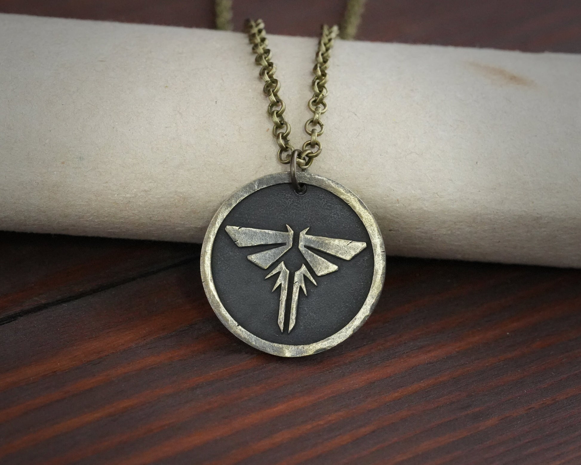Dies ist ein von Last of Us inspirierter Firefly-Anhänger. Er ist handgehämmert, sehr stark und robust. Dieser Anhänger hat viele Eigenschaften / sieht aus, als wäre er seit Ewigkeiten getragen worden und hätte viele Schlachten überstanden.
