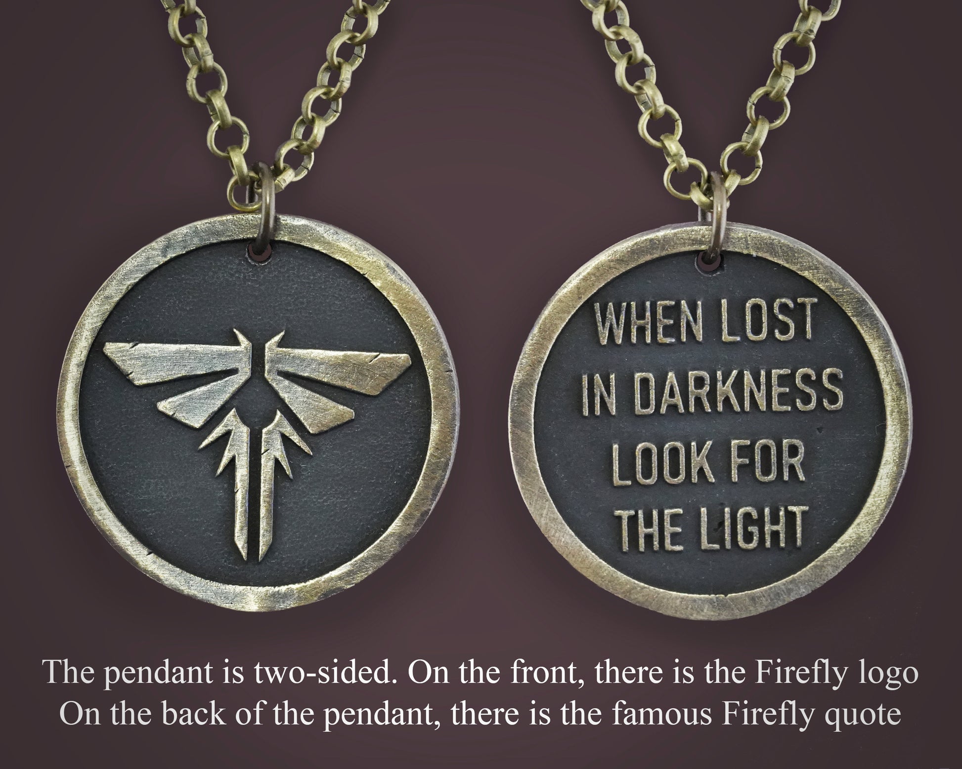 Der Anhänger ist zweiseitig. Auf der einen Seite befindet sich das Firefly-Logo und auf der anderen Seite das berühmte Firefly-Zitat.