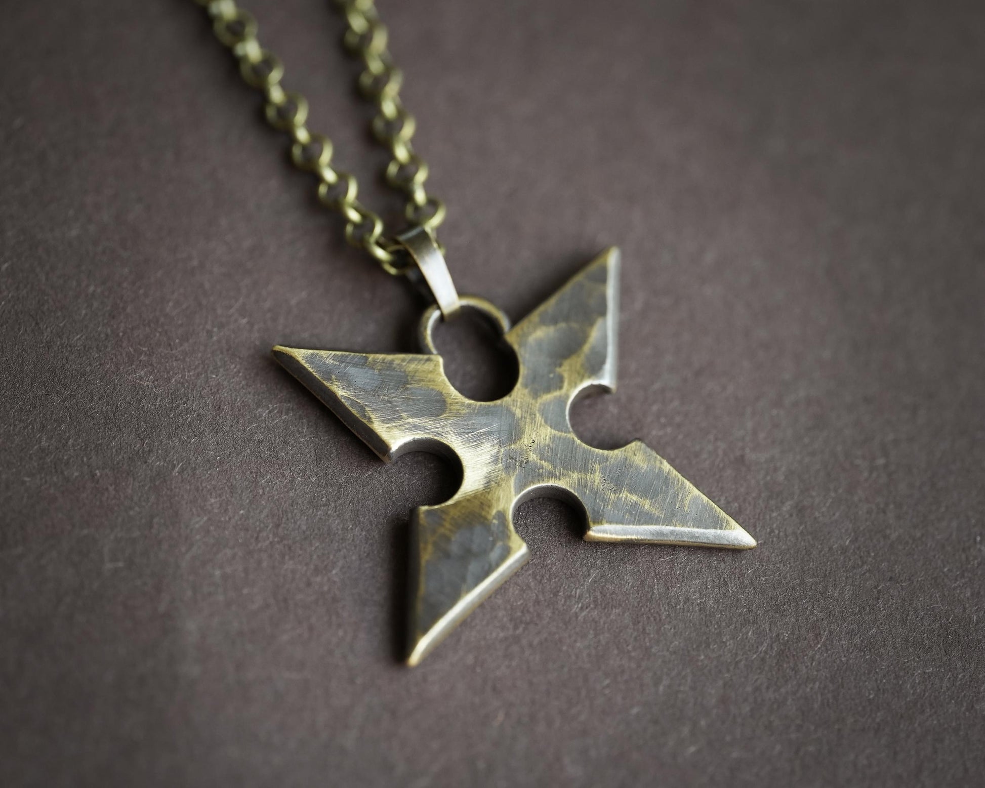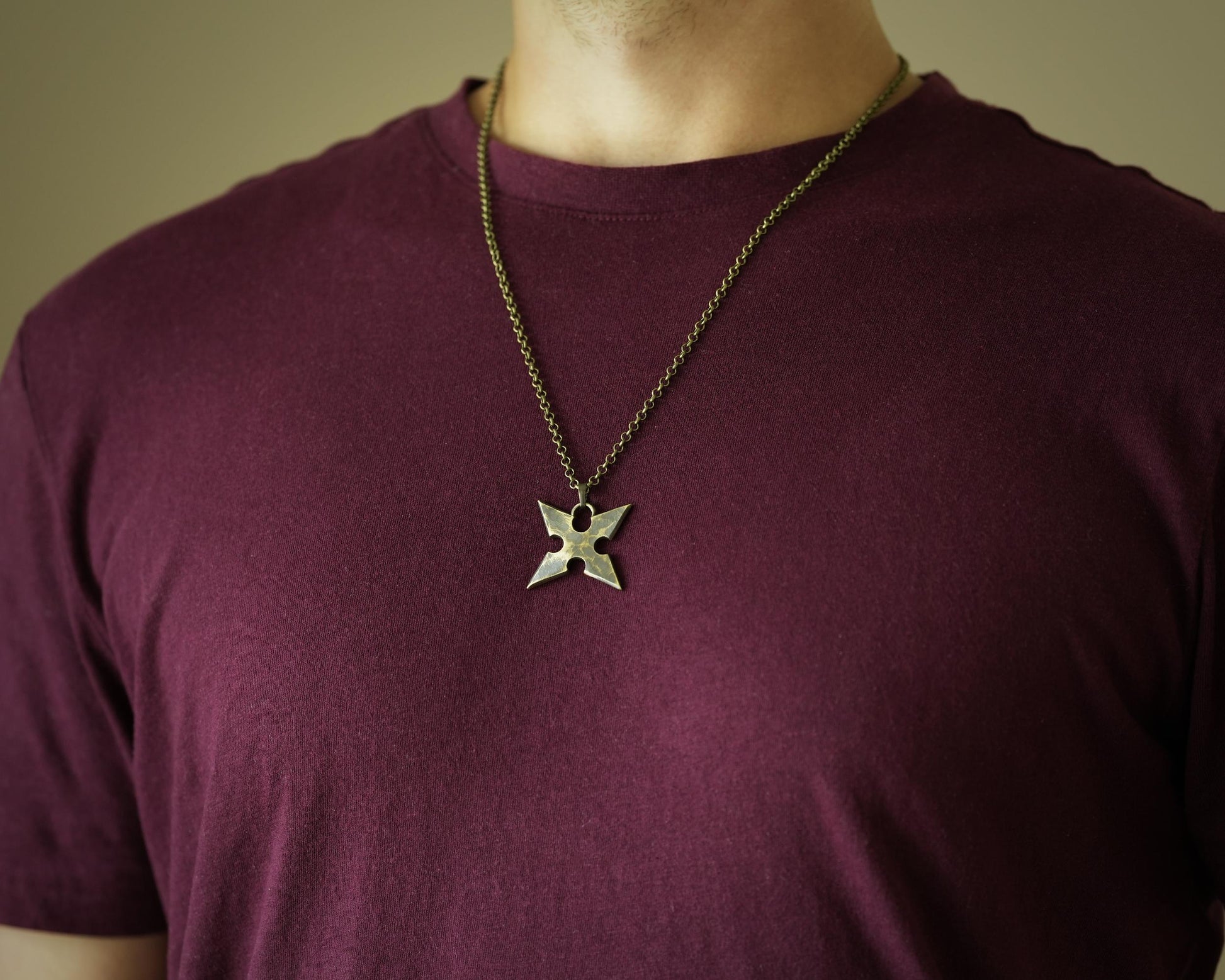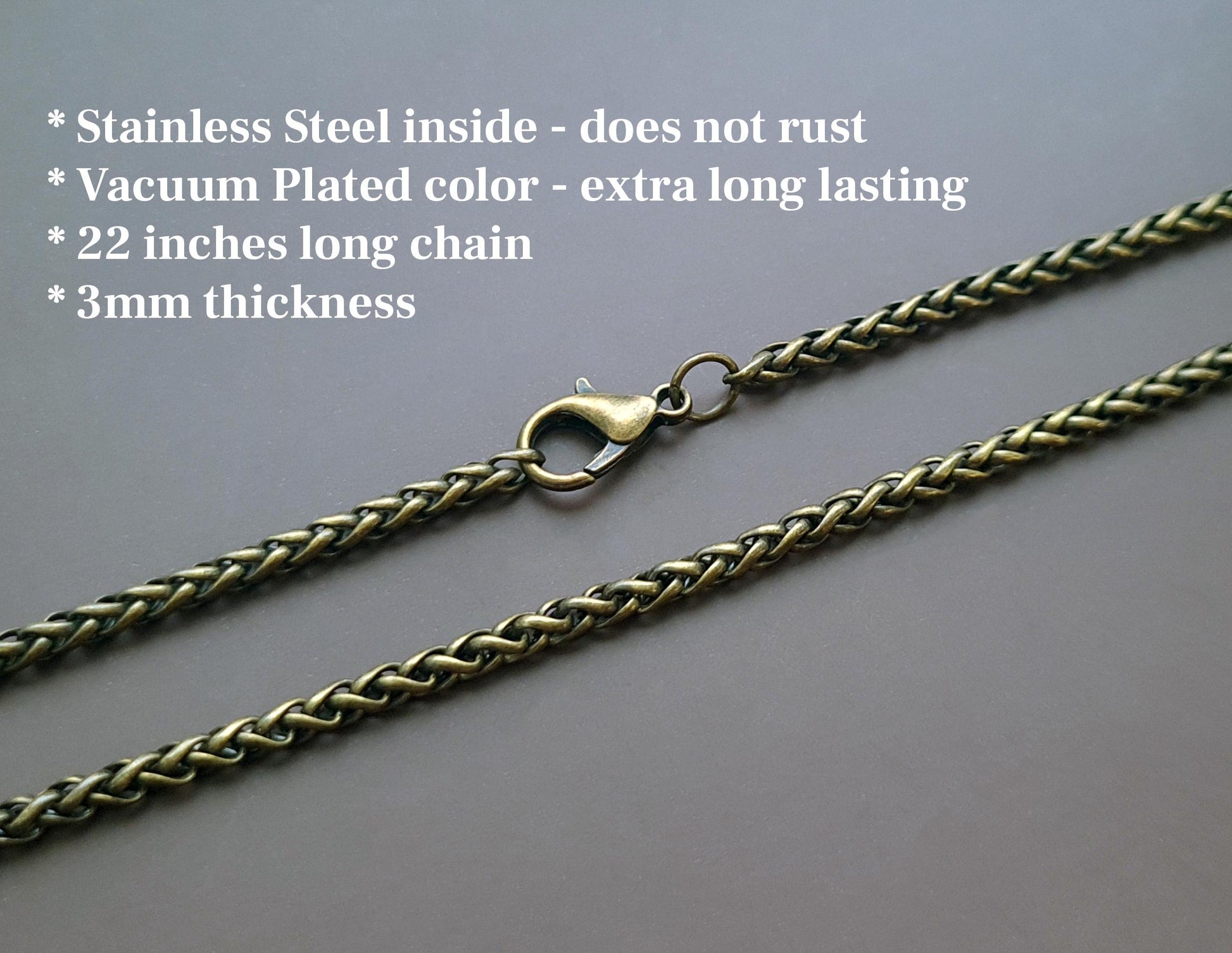 The pendant comes with a 22-inch long bronze-colored steel or stainless steel chain.